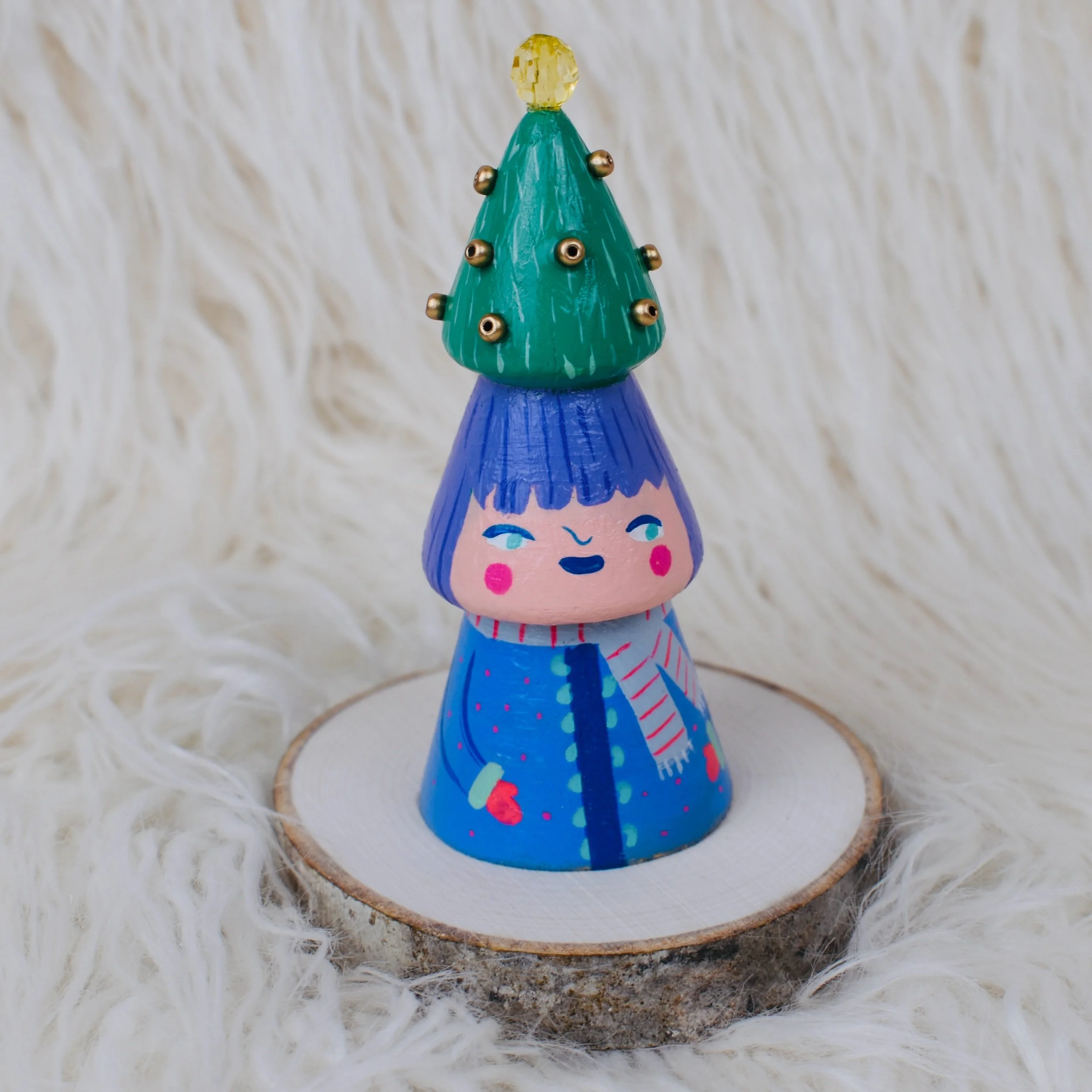 A sweet hand painted figurine. Painted by me with gouache and sealed with gloss. This lady is balancing a Christmas tree on her head, as one does! She is about 4.5” tall. Each one comes signed on the bottom. Xoxo.